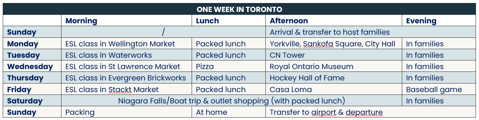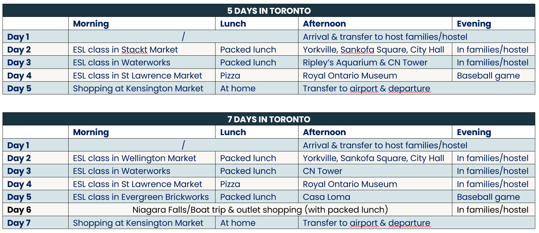 Day trips: Niagara Falls is an absolute must for any program and will be the highlight of your group visit. Our tour includes the boat trip to the Falls. Canada’s Wonderland is also a great theme park on the edge of the city.