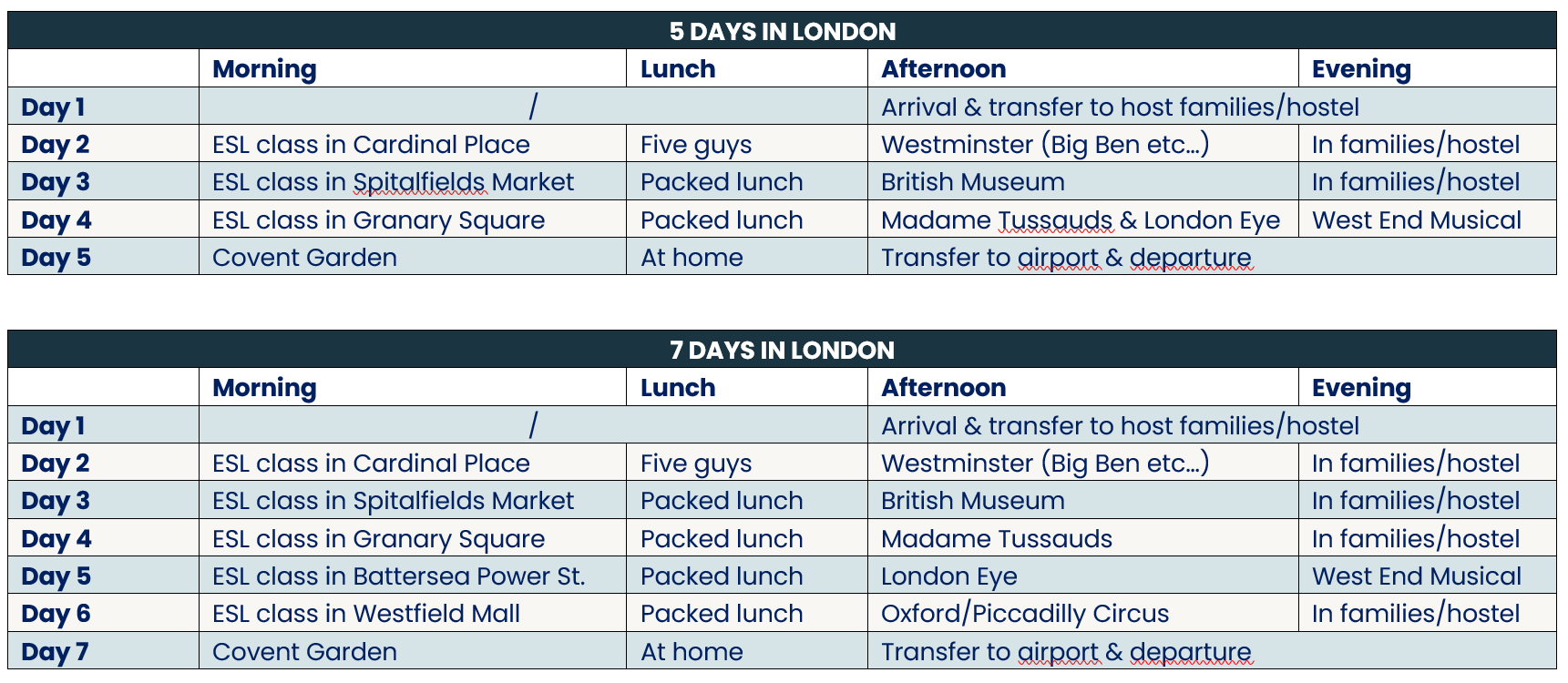 Groups choosing English classes will have their classes in locations across the cities, explore iconic sites, and experience cultural immersion in a host family or hostel setting.